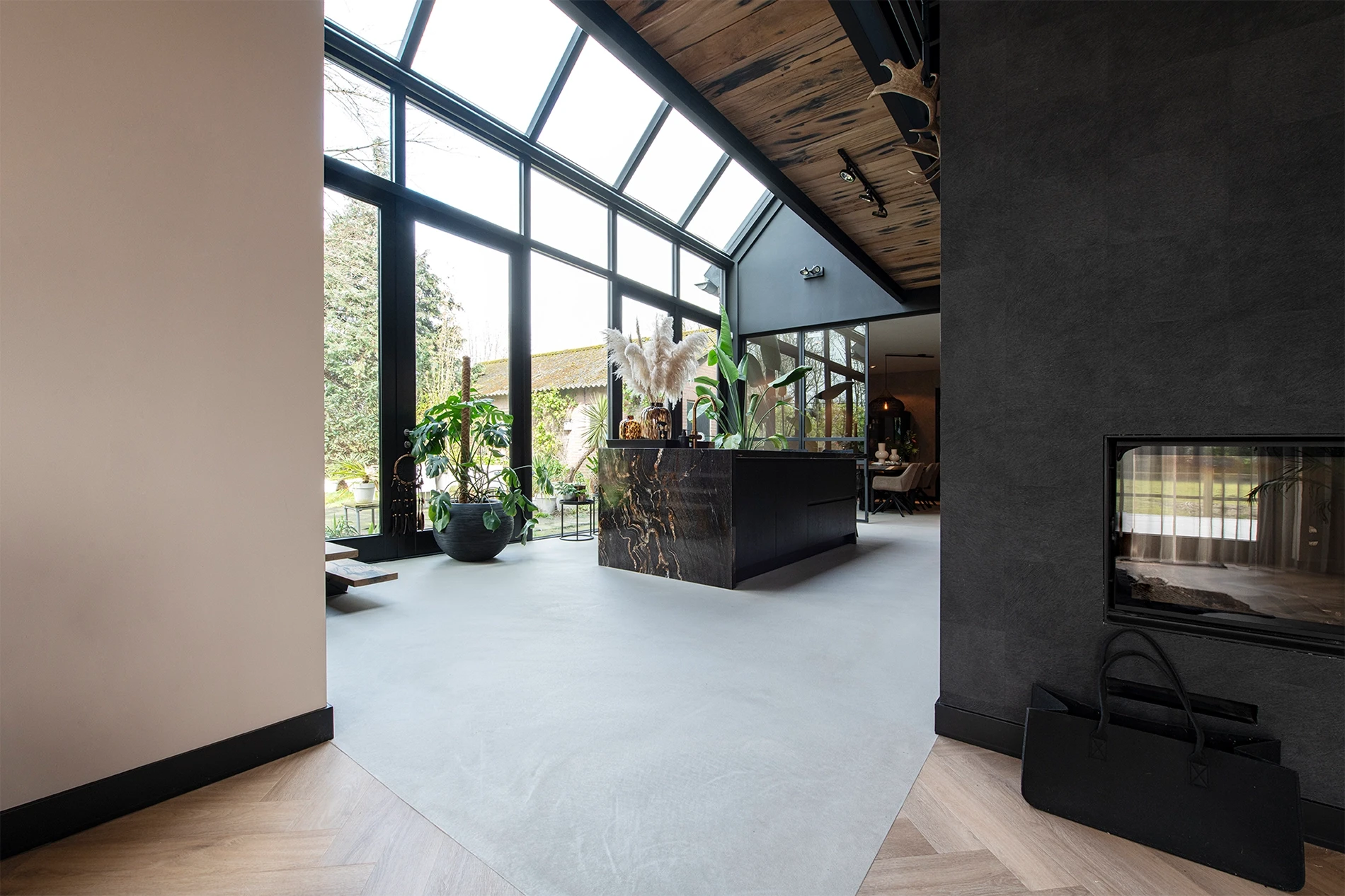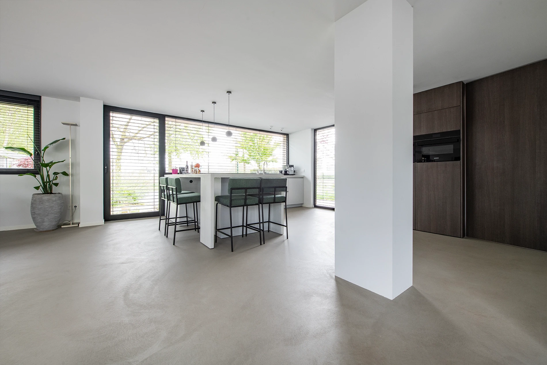 Colour: custom project colourThe atmospheric and practical Premium Leef-Beton floor was chosen for the kitchen, living room, and the showroom.