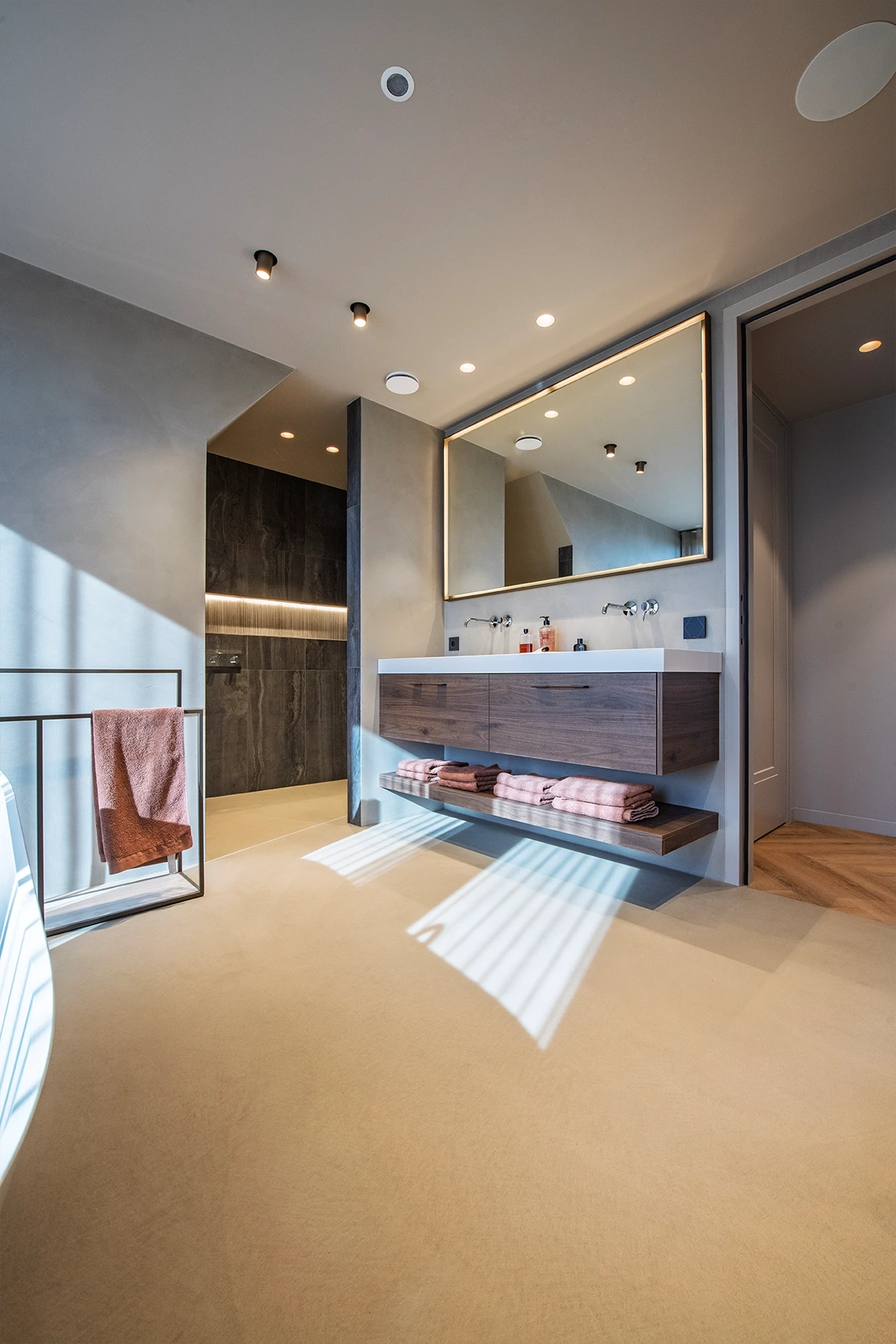 We were looking for a flooring system where warmth, practical use, hygiene, and vibrancy go hand in hand. With this Premium Leef-Beton floor, we found exactly what we were looking for for our ground floor, extending even into the bathroom and walk-in shower. The subtle color variations in the floor truly bring it to life.