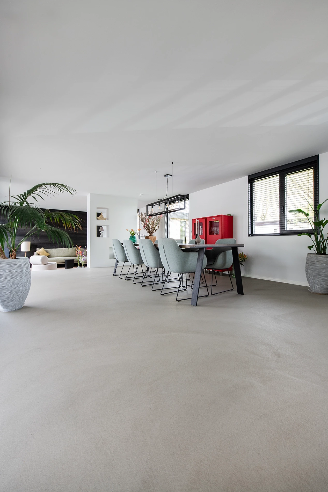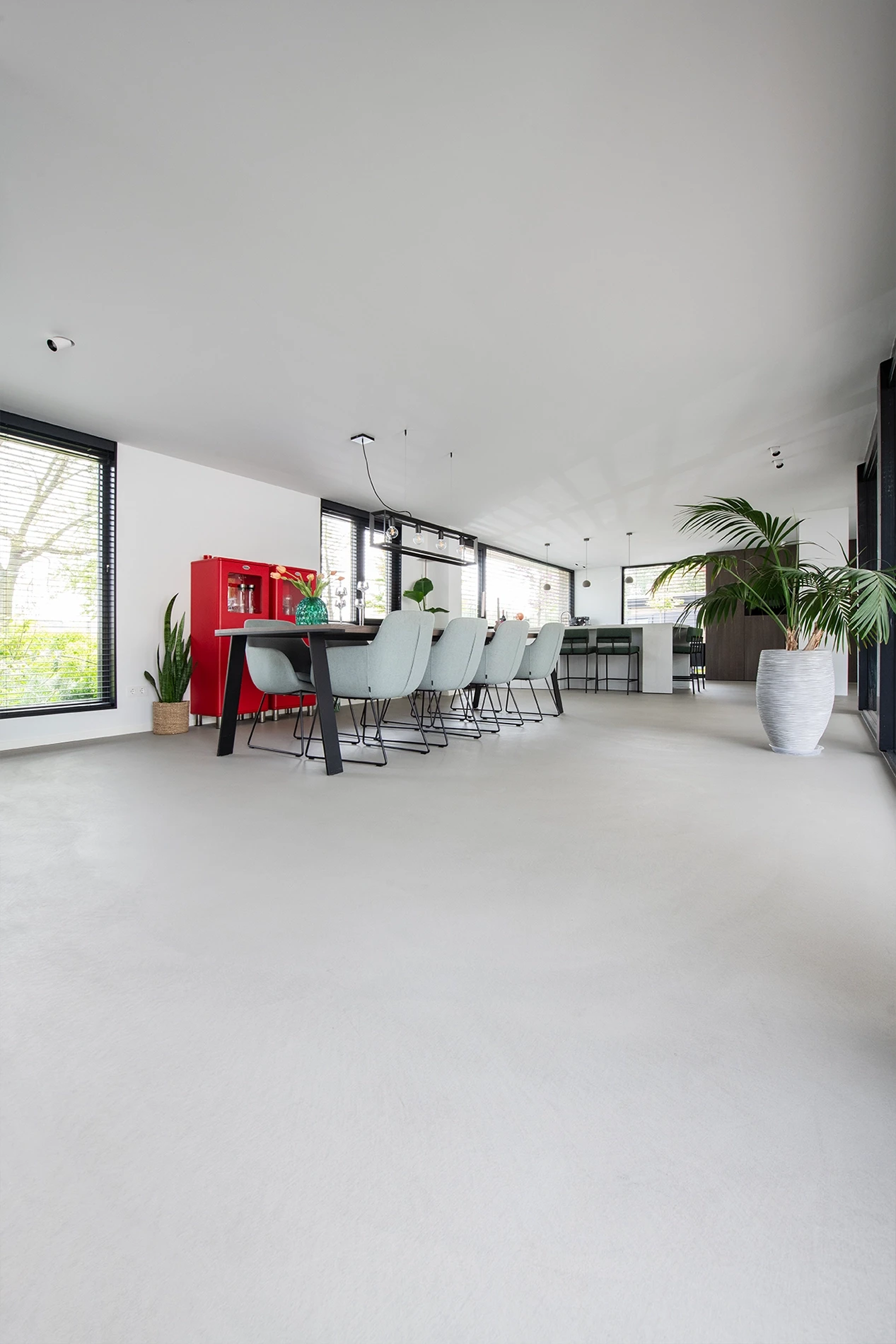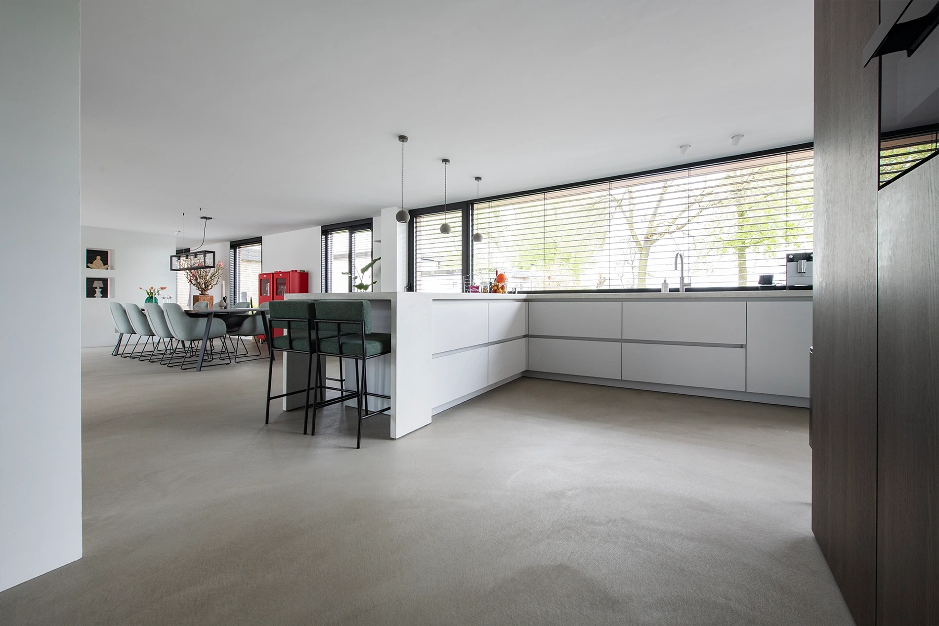 In Boxtel, North Brabant, the residents wanted to renovate their home. They chose a Premium Leef-Beton floor in the color Fossil. This cool living concrete floor was installed on the ground floor, covering an area of over 70 m². This seamlessly connects the hallway, toilet, and the large open kitchen. Just look at the pictures – the floor looks beautiful!