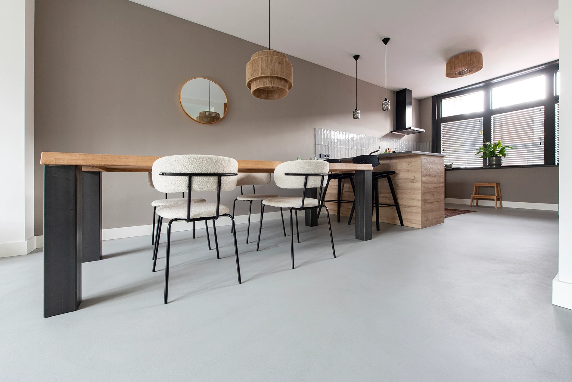 Kleur: projectkleur op maatIn de keuken, woonkamer en de showroom aan huis werd gekozen voor de sfeervolle én praktische Premium Leef-Beton vloer.