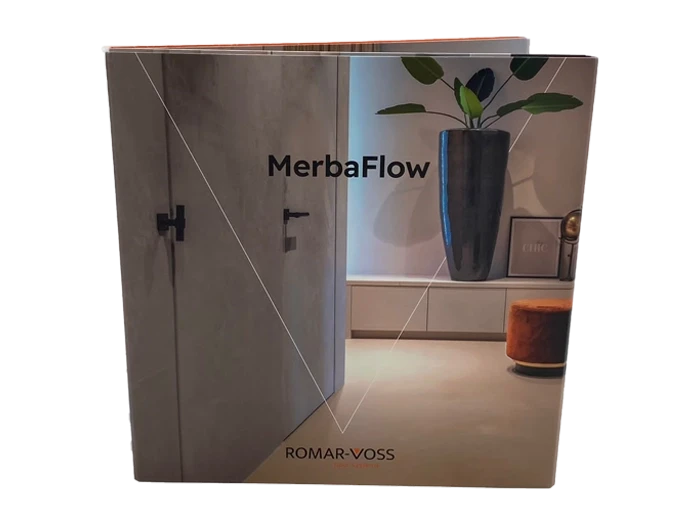 Een stalenmap waarin de 16 eigentijdse kleuren van onze PU gietvloerserie MerbaFlow worden gepresenteerd.